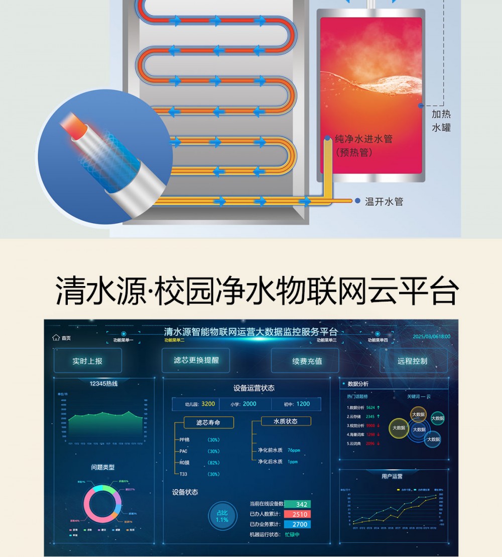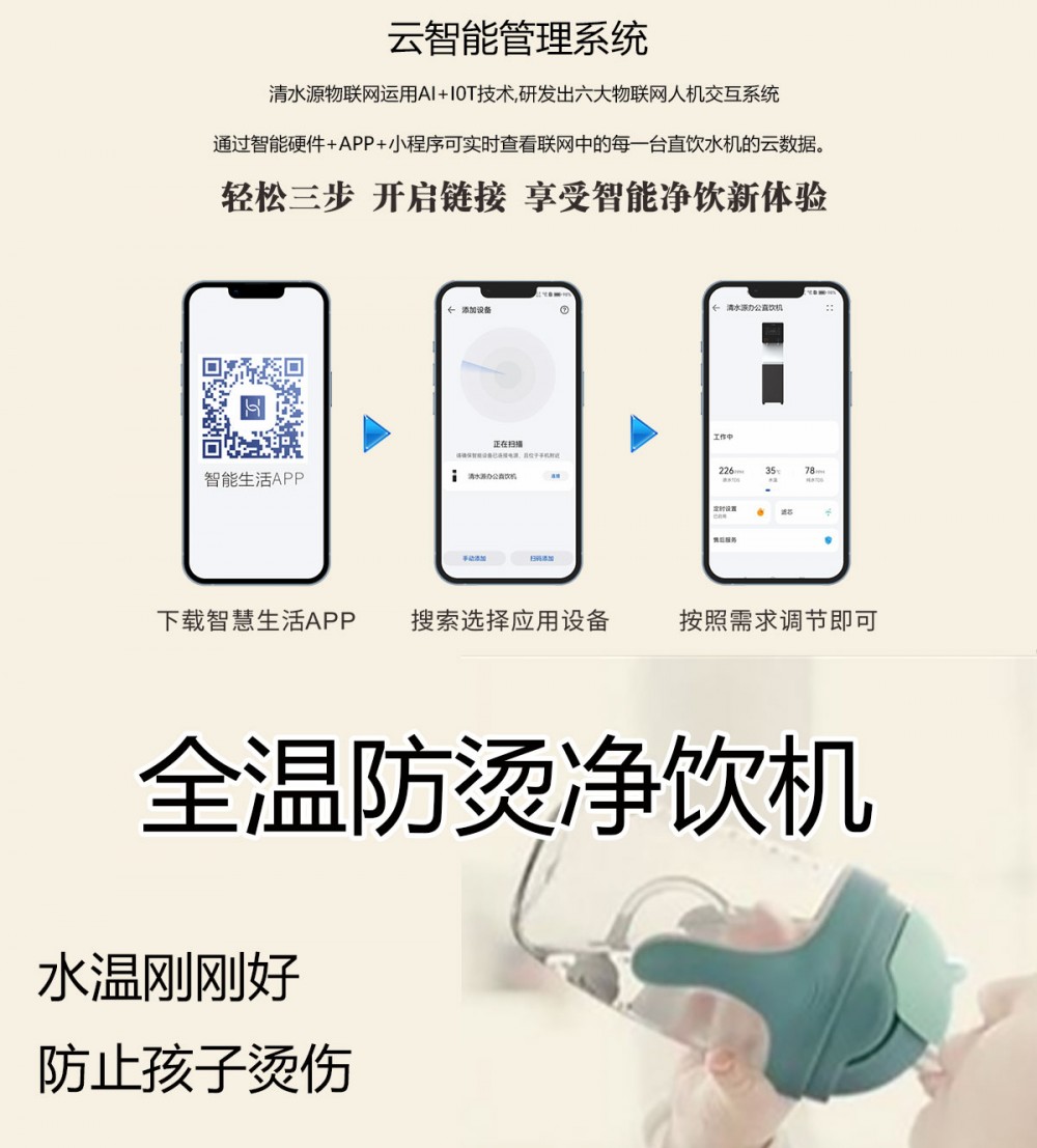 颜色图案可定制,产品尺寸550*450*1100mm,温开水出水量100L/H,电压220V,功率2kw,可供应50人,适用于幼儿园、早教机构。清水源二温节能式幼儿机, 外形尺寸偏小巧,适用于幼儿园内学生使用,该产品出水口仅出温开水,安全性足。 五级反渗透过滤功能,只能显示触屏功能配合远程开关及定时功能,使得用户使用感提升,性价比更高。具有100%煮开、高温杀菌系统,确保水质健康、检测无忧。定时开关机、隔夜水定时自动排空、物联网自动报修、水质实时监测、滤芯消耗更新显示、手机远程开关机等特点。零售价为12450元/台。联系电话:13138176786,公司名称:深圳清水源饮水设备有限公司,公司网址http://www.qsy68.com,公司座机服务热线:400-891-5619/0755-82246786。