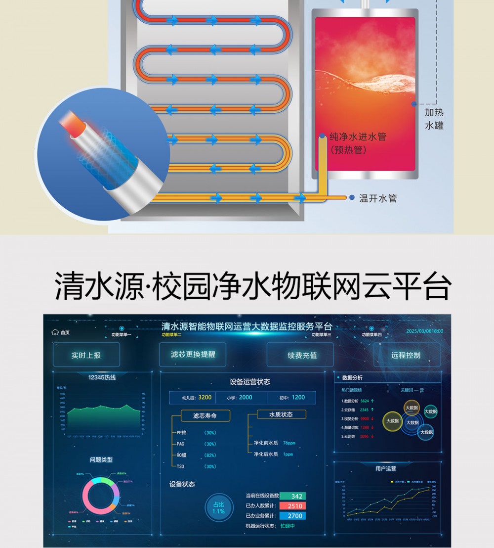 颜色图案可定制,产品尺寸550*450*1100mm,温开水出水量100L/H,电压220V,功率2kw,可供应50人,适用于幼儿园、早教机构。清水源二温节能式幼儿机, 外形尺寸偏小巧,适用于幼儿园内学生使用,该产品出水口仅出温开水,安全性足。 五级反渗透过滤功能,只能显示触屏功能配合远程开关及定时功能,使得用户使用感提升,性价比更高。具有100%煮开、高温杀菌系统,确保水质健康、检测无忧。定时开关机、隔夜水定时自动排空、物联网自动报修、水质实时监测、滤芯消耗更新显示、手机远程开关机等特点。零售价为13300元/台。联系电话:13138176786,公司名称:深圳清水源饮水设备有限公司,公司网址http://www.qsy68.com,公司座机服务热线:400-891-5619/0755-82246786。