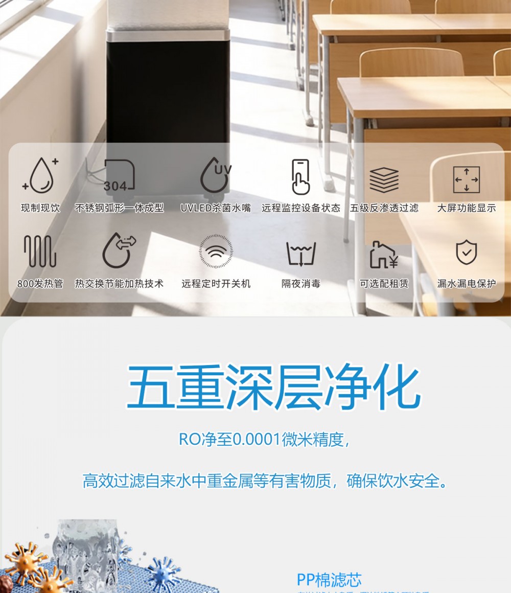 产品尺寸560*480*1750mm,出水量开水60L/H直饮水63L/H,电压380V,功率6kw,可供应100人。清水源品牌一开一直饮水步进式直饮机,水箱容量60L,该容量水箱可供应100人饮用。外形尺寸偏商务型。五级反渗透过滤功能,显示触屏功能配合远程开关及定时功能,使得用户使用感提升,性价比更高。 五级反渗透过滤功能,只能显示触屏功能配合远程开关及定时功能,使得用户使用感提升,性价比更高。具有100%煮开、高温杀菌系统,确保水质健康、检测无忧。定时开关机、隔夜水定时自动排空、物联网自动报修、水质实时监测、滤芯消耗更新显示、手机远程开关机等特点。零售价为15080元/台。联系电话:13138176786,公司名称:深圳清水源饮水设备有限公司,公司网址http://www.qsy68.com,公司座机服务热线:400-891-5619/0755-82246786。