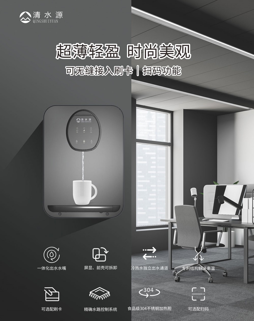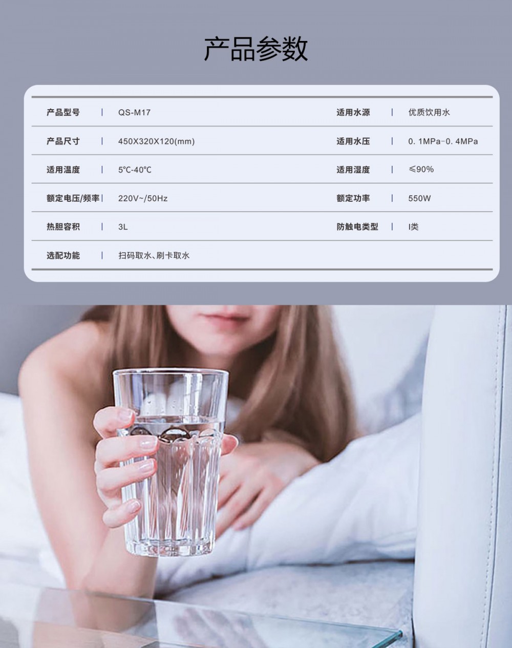 产品尺寸450*320*120mm,额定电压220V,功率550w。清水源品牌,壁挂式管线分机 QS-M17适用10-20人。一体化出水水嘴,有屏显、前壳可拆卸,冷热水立出水,食品级304不锈钢加热胆,有的水路控制系统,还可以选配刷卡或扫码。 具有100%煮开、高温杀菌系统,确保水质健康、检测无忧。定时开关机、隔夜水定时自动排空、物联网自动报修、水质实时监测、滤芯消耗更新显示、手机远程开关机等特点。零售价为1580元/台。联系电话:13138176786,公司名称:深圳清水源饮水设备有限公司,公司网址http://www.qsy68.com,公司座机服务热线:400-891-5619/0755-82246786。